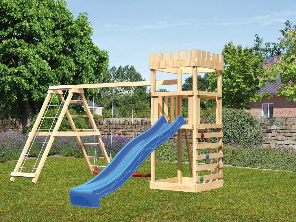 • Spielturm Löwenherz, inkl. Doppelschaukel, Kletterwand, Rutsche blau