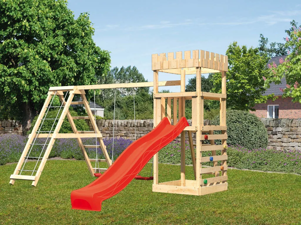 • Spielturm Löwenherz, inkl. Doppelschaukel, Kletterwand, Rutsche rot