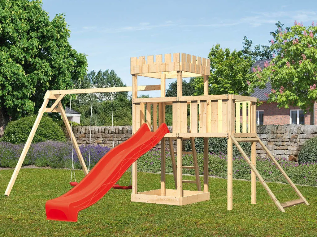 Material: Holz, BxTxH: 107x107x259,5 cm, inkl. Doppelschaukelanbau, Anbauplattform, Netzrampe, Rutsche rot