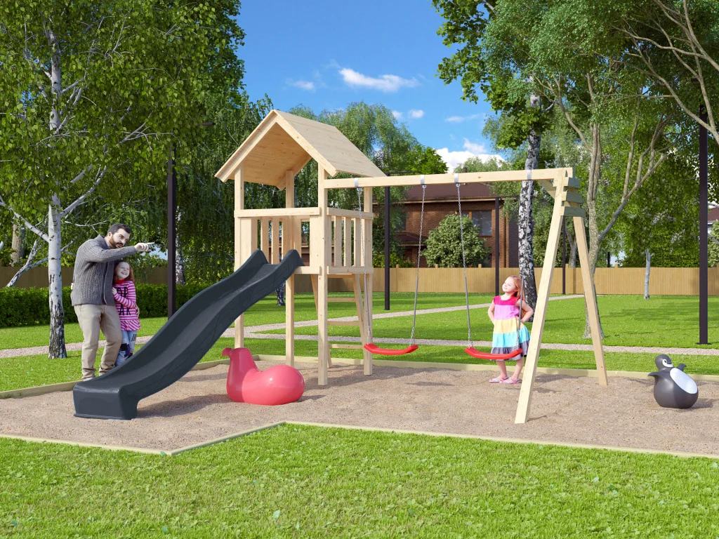 Spielturm Set Lotti naturbelassen inkl. Rutsche anthrazit + Doppelschaukel
