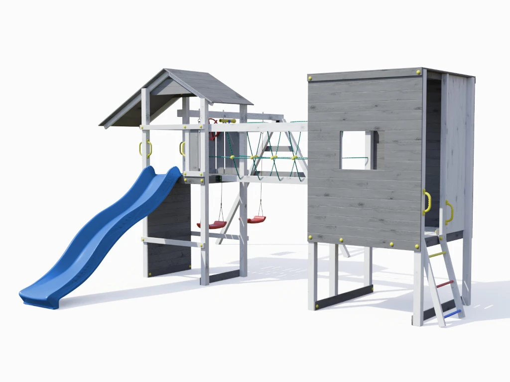 Bei diesem Spielturm steht viel Bewegung auf dem Programm. Ein eigenes Abenteuerland für dein Kind für jede Menge Spiel und Spaß! Die Firsthöhe liegt bei 254 cm.