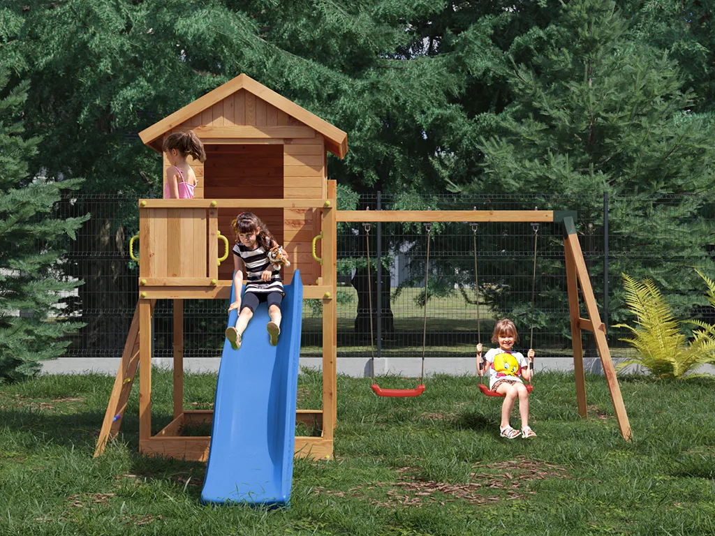Spielturm mit Rutsche, Podest, Doppelschaukel und Leiter
