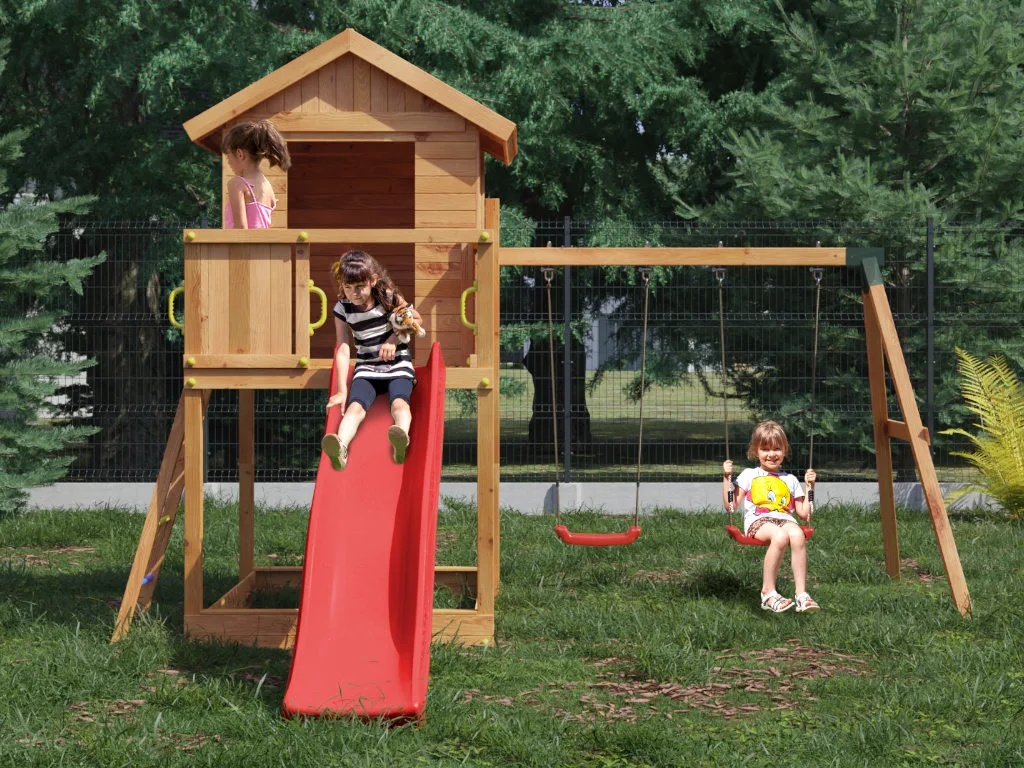 Spielturm Stelzenhaus Galaxy S inkl. Doppelschaukel teakfarben + Rutsche rot