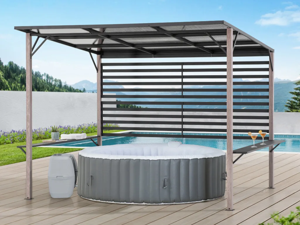 Eine Pergola über dem Whirlpool vereint Luxus mit Funktionalität und schafft eine perfekte Wohlfühloase in deinem Garten. Sie bietet stilvollen Schutz vor Sonne, Regen und neugierigen Blicken, während sie eine elegante Ergänzung zu deinem Außenbereich darstellt. Mit modernen Designs und hochwertigen Materialien wird die Pergola zum Highlight deiner Wellnessecke
