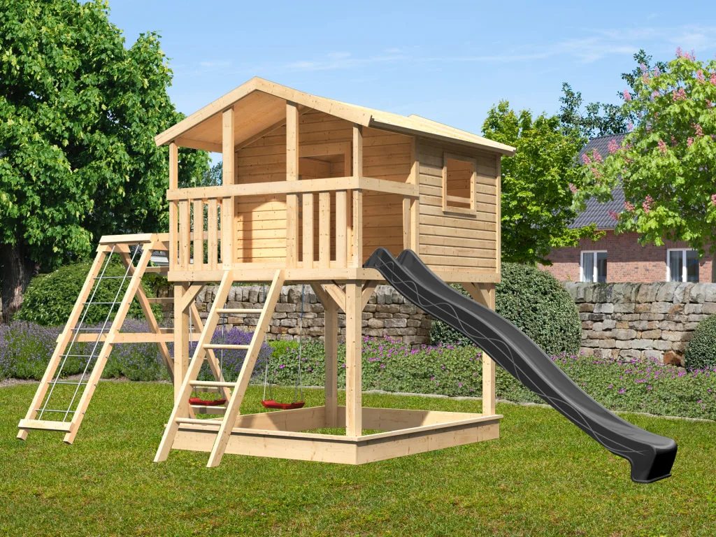 Dieses Stelzenhaus ist ein spannender Abenteuerort – die Plattform ist ähnlich wie bei einem Baumhaus erhöht und kann erklommen werden. Mit einer Grundfläche von 2,95 m² lässt es sich hier wunderbar spielen und toben. Die Wandstärke von 19 mm sorgt für Stabilität. Bitte beachten: Von diesem Spielturm sind verschiedene Ausführungen erhältlich (siehe oberhalb des Warenkorb-Buttons).