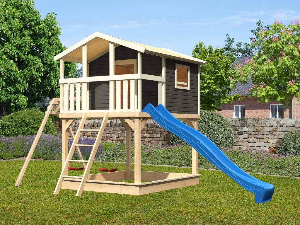 Material: Holz, B x T x H: 198 x 243 x 309 cm, inkl. Doppelschaukel, Rutsche blau, Holzleiter