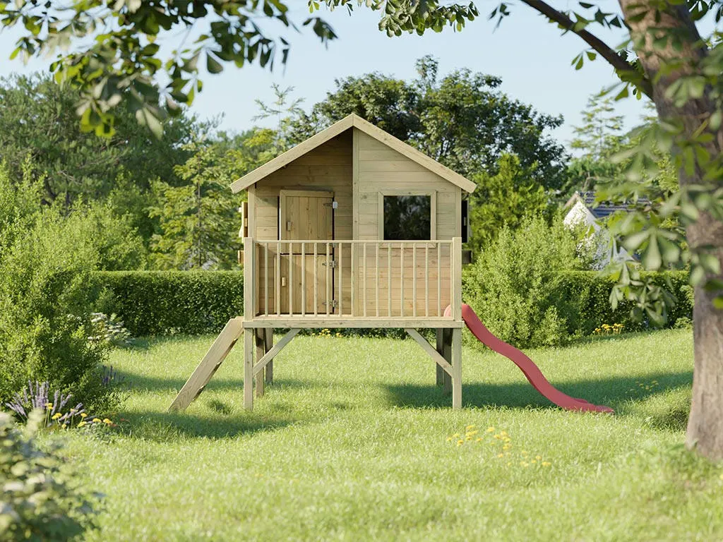 Das Stelzenhaus wird mit Einzeltür und 3 Fenstern geliefert und sorgt für großes Spielvergnügen bei den Kindern.