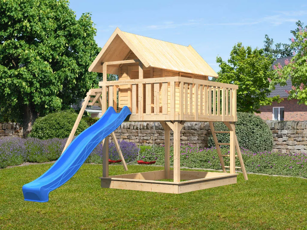 Material: Holz, B x T x H: 198 x 243 x 329,5 cm, inkl. Doppelschaukel, Wellenrutsche blau, Holzleiter