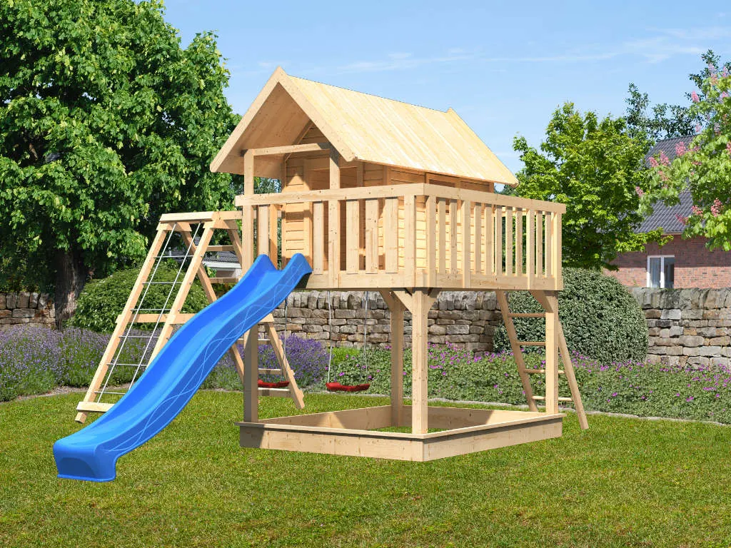 Nicht für Kinder unter 3 Jahren geeignet. Geeignet für Kinder von 3 bis 14 Jahren. Benutzung nur unter unmittelbarer Aufsicht von Erwachsenen. Stolper- und/oder Sturzgefahr. Nur für den häuslichen, privaten Bereich (DIN EN 71-8). Ausschließlich für die Verwendung im Freien. Spieltürme/Stelzenhäuser mit einer Spielhöhe von über 60 cm müssen auf einer weichen Unterlage wie Gras oder Holzspänen aufgestellt werden. Bei Spieltürmen/Stelzenhäusern mit einer Spielhöhe unter 60 cm wird eine weiche Unterlage ebenfalls empfohlen. Die Grundkonstruktion ist in regelmäßigen Abständen auf etwaige Beschädigung und Fäulnisbefall zu kontrollieren. Um die Stabilität zu gewährleisten, müssen die Pfosten im Boden verankert werden. Die Schraubverbindungen sind in regelmäßigen Abständen (ca. 4 Wochen, je nach Benutzungshäufigkeit und Alter des Spielgerätes) auf festen Sitz und Stabilität zu überprüfen. Die angegebenen Maße können geringfügig abweichen.