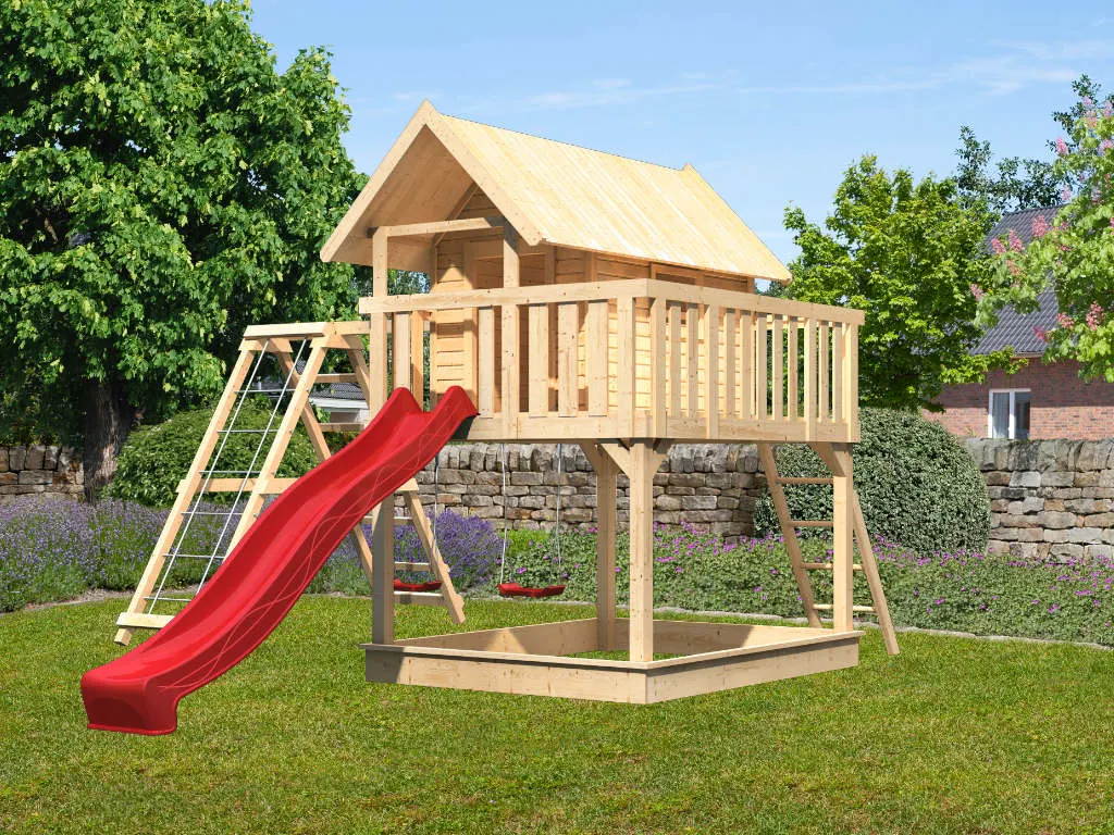 Material: Holz, B x T x H: 198 x 243 x 329,5 cm, inkl. Doppelschaukel Anbau, Netzrampe, Wellenrutsche rot, Holzleiter