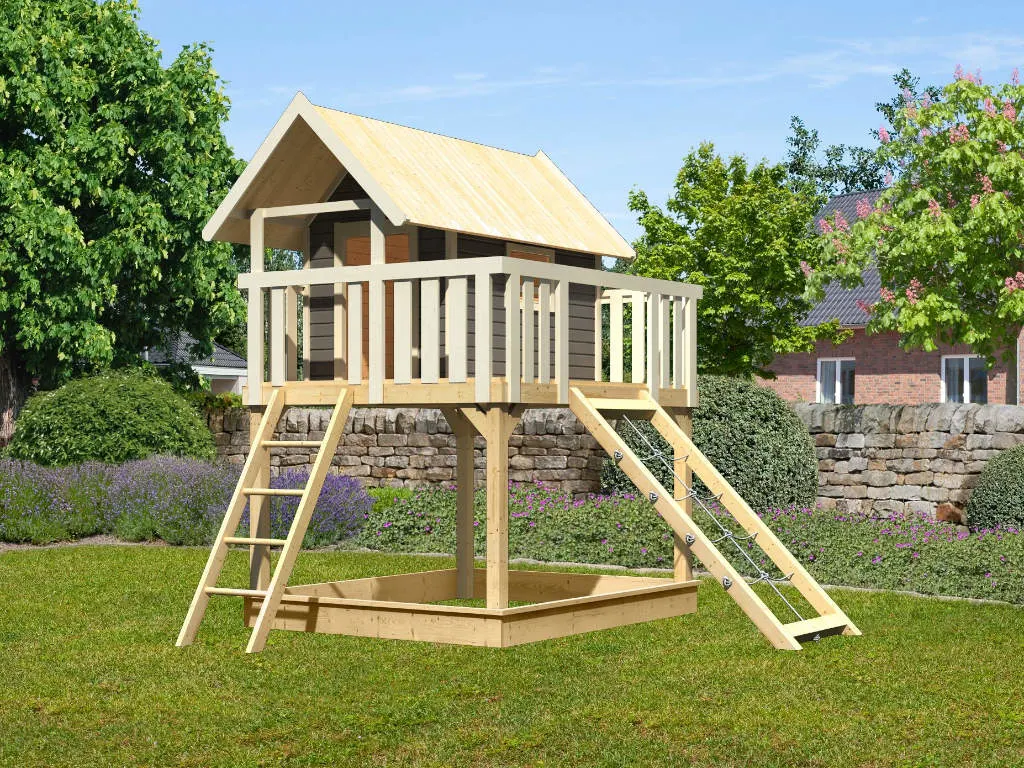 Dieses Stelzenhaus ist ein spannender Abenteuerort – die Plattform ist ähnlich wie bei einem Baumhaus erhöht und kann erklommen werden. Mit einer Grundfläche von 4,81 m² lässt es sich hier wunderbar spielen und toben. Die Wandstärke von 19 mm sorgt für Stabilität.