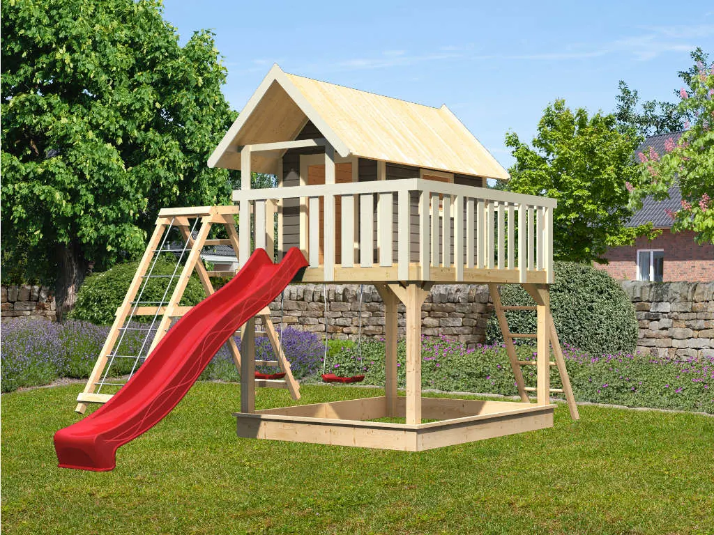 Material: Holz, B x T x H: 198 x 243 x 329,5 cm, inkl. Doppelschaukel, Klettergerüst, Netzrampe, Wellenrutsche rot, Holzleiter