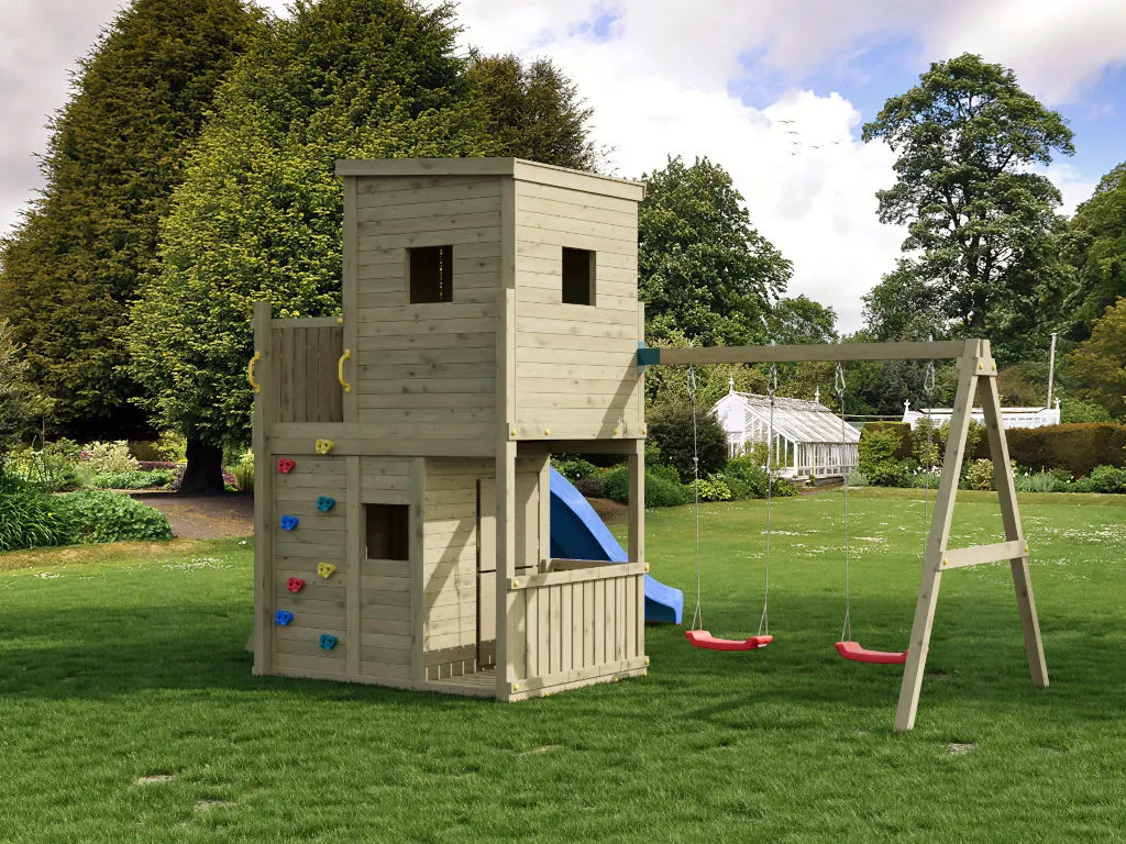 Material: Holz, B x T x H: 480 x 367 x 298 cm, inkl. Doppelschaukel + Kletterwand