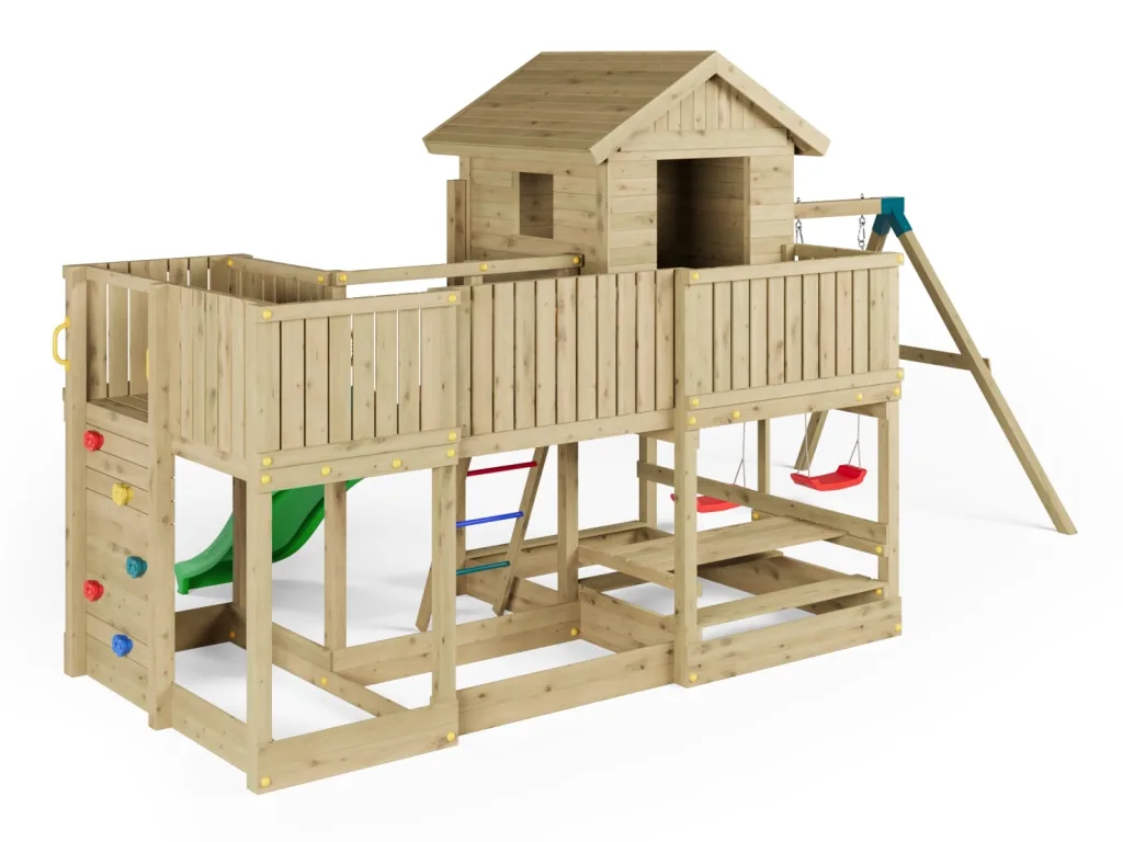 Dieses Stelzenhaus bietet deinem Kind ein eigenes Reich in erwachsenenfreier Zone. Das Häuschen ist durch die Stelzen nicht allzu leicht zu erreichen und fördert den kindlichen Bewegungseifer. Das Außenmaß des Spielhauses beträgt 480 x 367 x 298 cm.