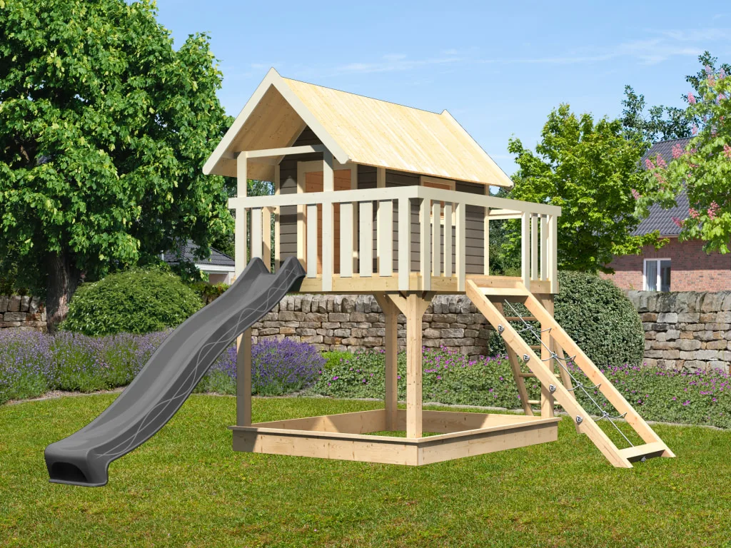 Stelzenhaus SET Fidel terragrau inkl. Rutsche anthrazit + Netzrampe
