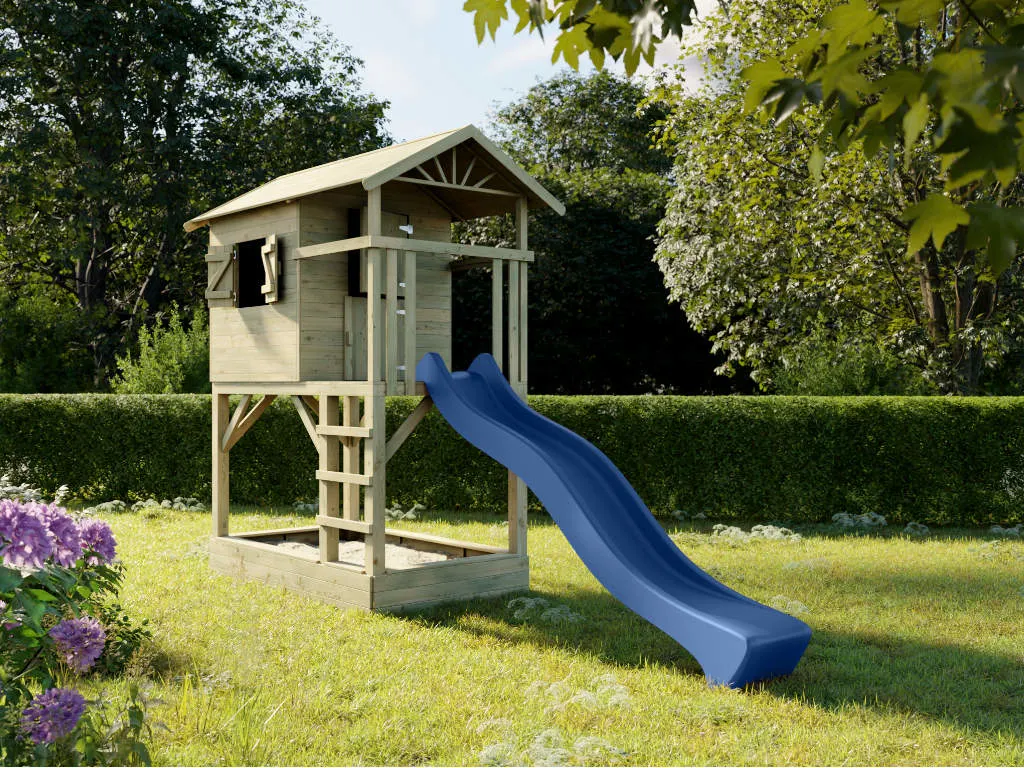 Dieses Sparset enthält das Prestige Garden Stelzenhaus Tree Hut mit Sandkasten inkl. Podest und Rutsche.