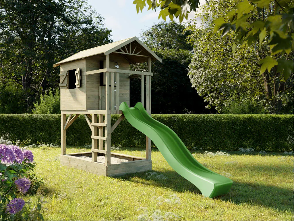 | Lieferumfang | Stelzenhaus Tree Hut, Leiter, Fensterläden, Veranda, Handgriff, Sandkasten, detaillierte Montageanleitung, KBT Rutsche Tsuri 290 cm |