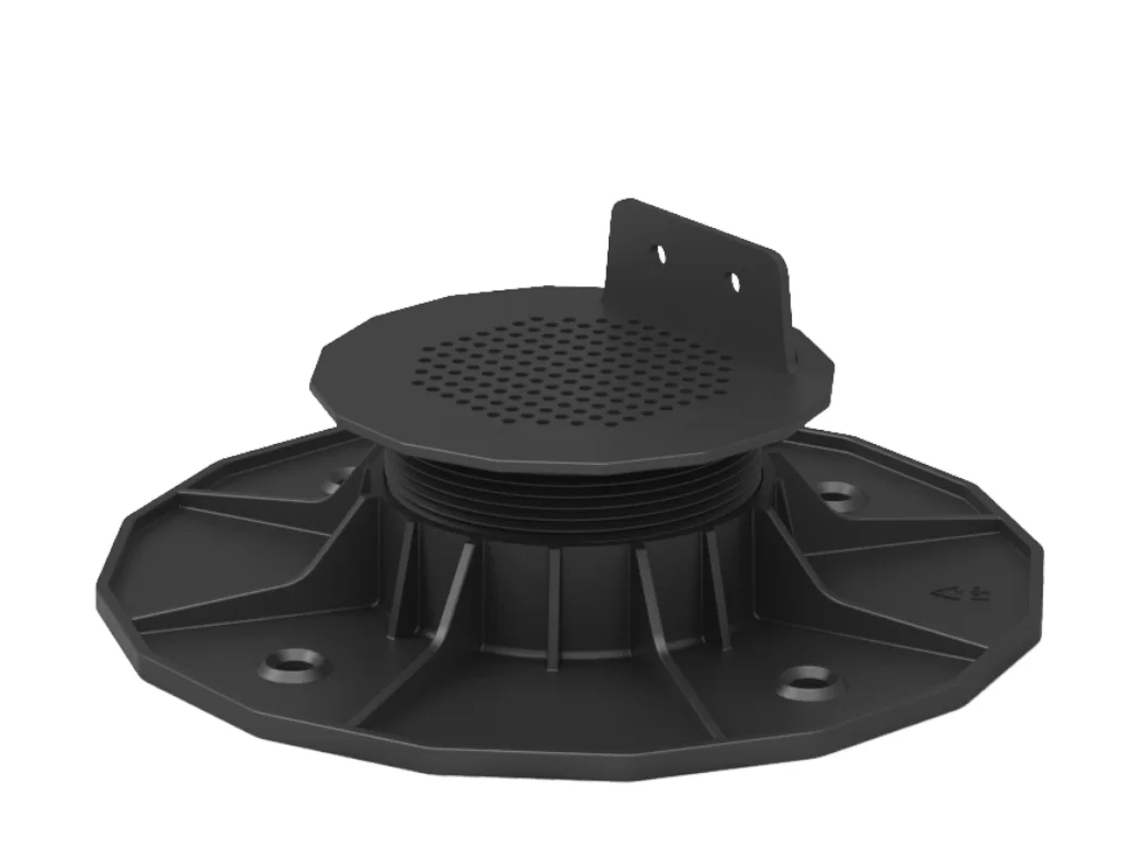 Dieser Kunststoffstellfuß mit einem Verstellbereich von 30–50 mm passt sich präzise den Anforderungen des Geländes sowie des Untergrundes an und lässt sich auch gut bei einer Hanglage oder kleinen Bodenunebenheiten einsetzen. Selbst unter Belastung sind die Träger noch verstellbar. Höchst robust und langlebig hält der Stellfuß Umwelt- und Witterungseinflüssen stand. Die Auflagefläche des abgerundeten Tellerbodens von 20 cm Ø verhindert, dass er in den Untergrund gedrückt wird. Integrierte Stege lassen Wasser abfließen und verhindern Staunässe. Seitliche Lastenverteiler sorgen für eine gleichmäßige Verteilung des Gewichts auf die gesamte Fläche des Standfußes. Pro m² werden ca. 5 Stellfüße benötigt. Einfach, schnell, ohne Vorarbeit und ohne Werkzeug montierbar!