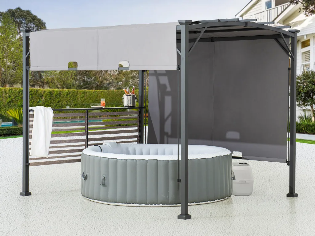 Eine Pergola über dem Whirlpool vereint Luxus mit Funktionalität und schafft eine perfekte Wohlfühloase in deinem Garten. Sie bietet stilvollen Schutz vor Sonne, Regen und neugierigen Blicken, während sie eine elegante Ergänzung zu deinem Außenbereich darstellt. Mit modernen Designs und hochwertigen Materialien wird die Pergola zum Highlight deiner Wellnessecke