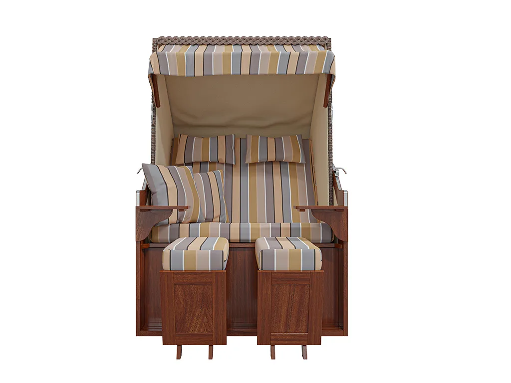 Mache es dir in deinem Strandkorb gemütlich. Die mitgelieferten Sitzpolster, Wurf und Nackenkissen laden dich zum Kuscheln ein, egal bei welcher Jahreszeit. Die langen und extradicken Fußkissen auf den ausziehbaren Fußstützen sorgen für Extra-Komfort.