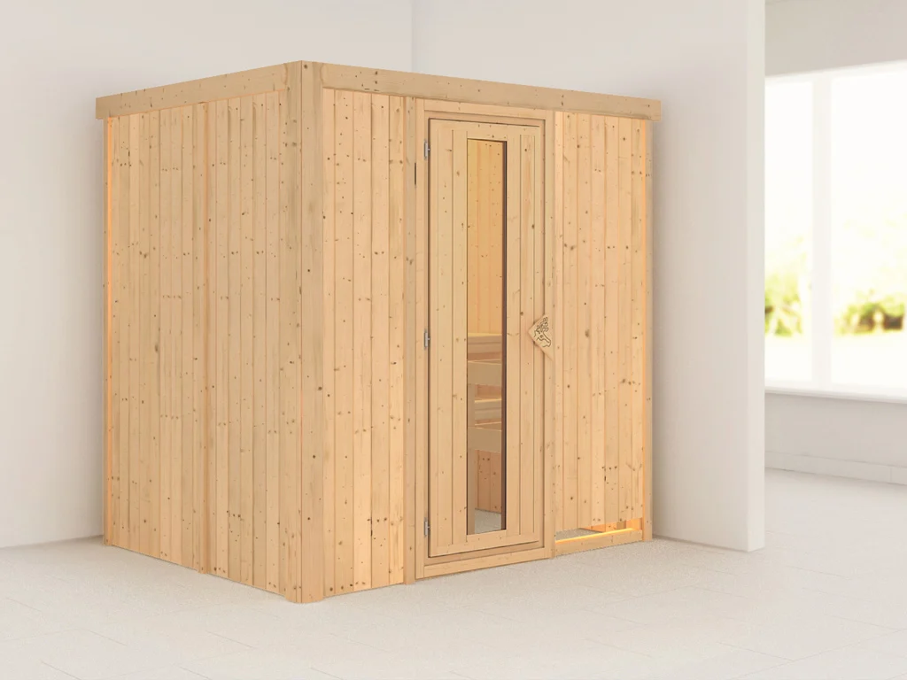 Dieses Saunamodell – eine System- bzw. Elementsauna – zeichnet sich durch seine besondere Sandwich-Bauweise aus, d.h. die Wandelemente bestehen aus einzelnen Schichten. Die bereits vorgefertigten Wandelemente ermöglichen einen schnellen Aufbau innerhalb weniger Stunden.