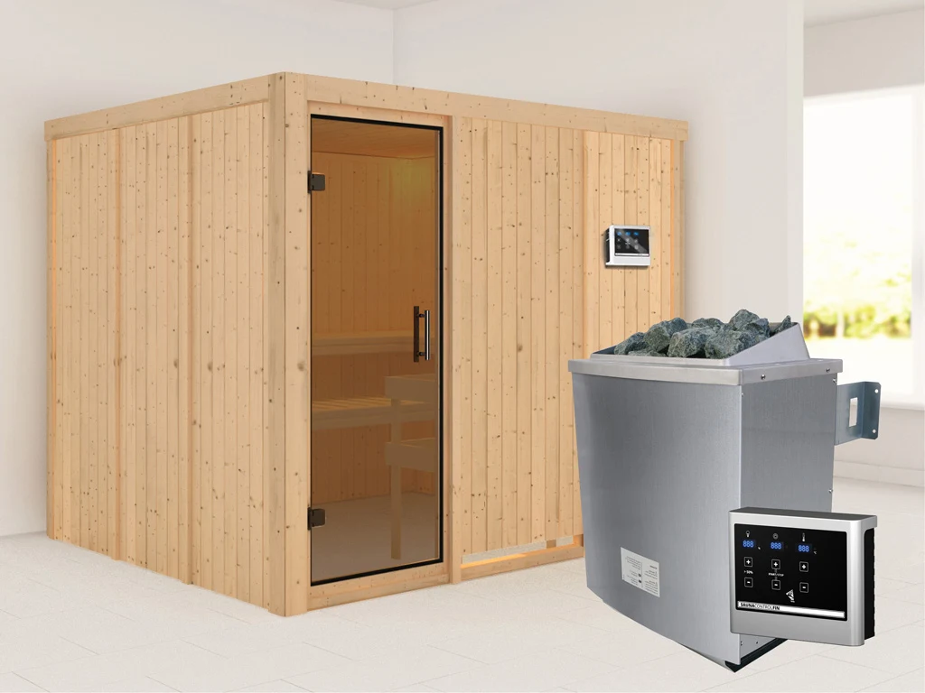 Bei dieser Innensauna ist ein Saunaofen mit einer externen Steuerung inklusive. Das Steuergerät wird außerhalb der Sauna angebracht. Auf diese Weise fängt schon vor dem Saunieren der Komfort an – mit einer bequemen Bedienung von außen und einer noch exakteren Temperatureinstellung. Weitere elektrische Geräte, wie die Kabinenbeleuchtung, können ebenso an die externe Steuerung angeschlossen und bedient werden.