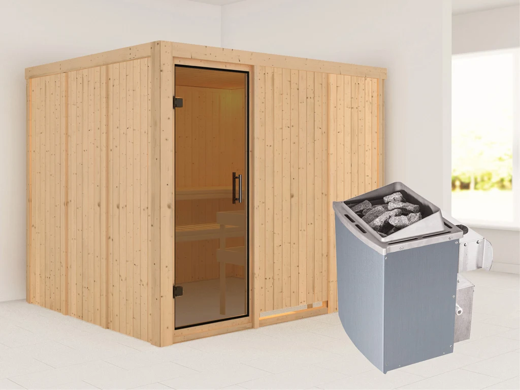 Diese Sauna wird einschließlich eines Bio-Kombiofens mit integrierter Steuerung geliefert. Am Ofen verbaut, ist die integrierte Steuerung durch Drehschalter sehr leicht zu bedienen.