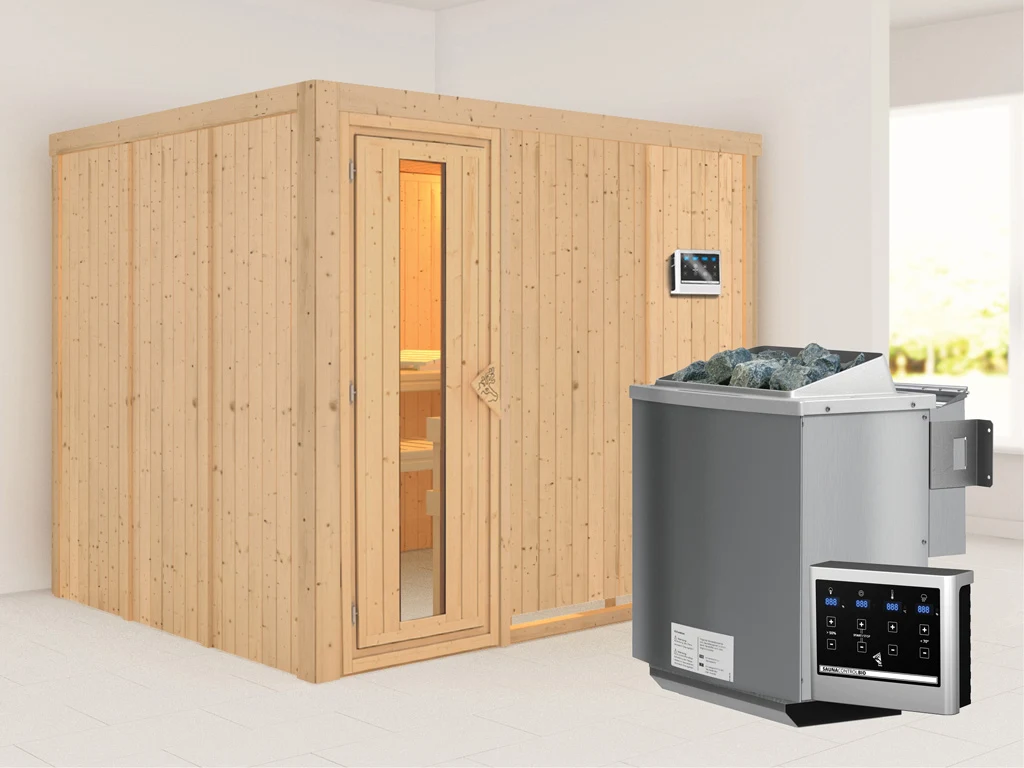 Bei dieser Innensauna ist ein Saunaofen mit einer externen Steuerung inklusive. Das Steuergerät wird außerhalb der Sauna angebracht. Auf diese Weise fängt schon vor dem Saunieren der Komfort an – mit einer bequemen Bedienung von außen und einer noch exakteren Temperatureinstellung. Weitere elektrische Geräte, wie die Kabinenbeleuchtung, können ebenso an die externe Steuerung angeschlossen und bedient werden.