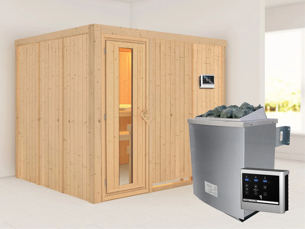 Bei dieser Innensauna ist ein Saunaofen mit einer externen Steuerung inklusive. Das Steuergerät wird außerhalb der Sauna angebracht. Auf diese Weise fängt schon vor dem Saunieren der Komfort an – mit einer bequemen Bedienung von außen und einer noch exakteren Temperatureinstellung. Weitere elektrische Geräte, wie die Kabinenbeleuchtung, können ebenso an die externe Steuerung angeschlossen und bedient werden.