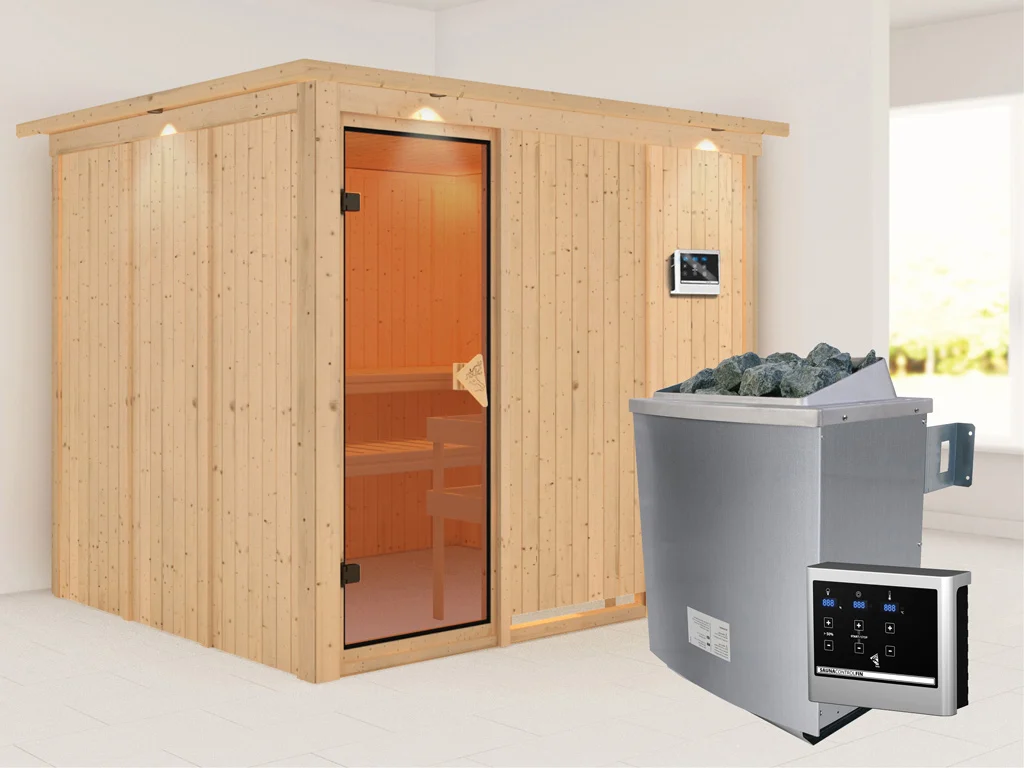 Bei dieser Innensauna ist ein Saunaofen mit einer externen Steuerung inklusive. Das Steuergerät wird außerhalb der Sauna angebracht. Auf diese Weise fängt schon vor dem Saunieren der Komfort an – mit einer bequemen Bedienung von außen und einer noch exakteren Temperatureinstellung. Weitere elektrische Geräte, wie die Kabinenbeleuchtung, können ebenso an die externe Steuerung angeschlossen und bedient werden.