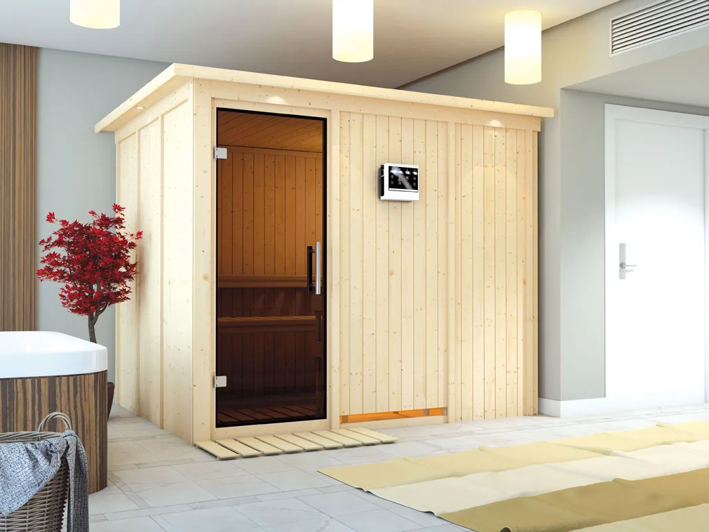 Bei dieser Innensauna ist ein Saunaofen mit einer externen Steuerung inklusive. Das Steuergerät wird außerhalb der Sauna angebracht. Auf diese Weise fängt schon vor dem Saunieren der Komfort an – mit einer bequemen Bedienung von außen und einer noch exakteren Temperatureinstellung. Weitere elektrische Geräte, wie die Kabinenbeleuchtung, können ebenso an die externe Steuerung angeschlossen und bedient werden.
