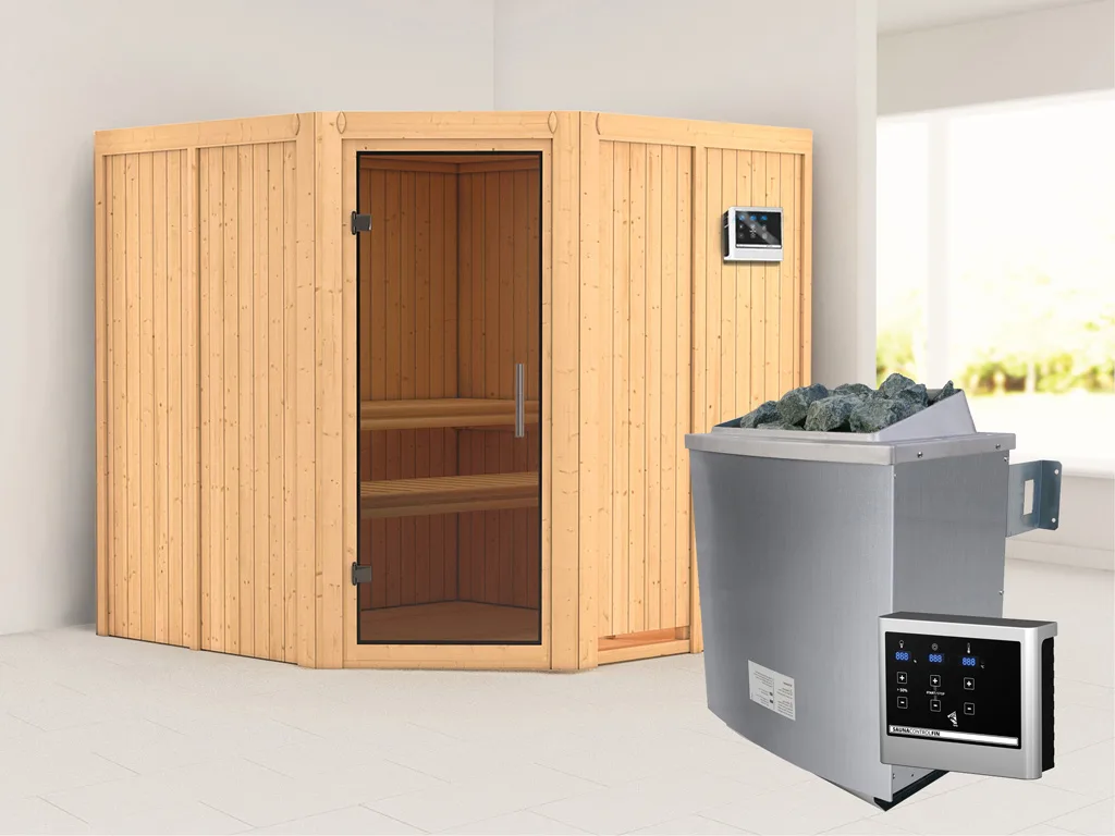 Diese Innensauna wird mit Saunaofen und einer externen Steuerung geliefert. Die Anbringung des Steuergerätes erfolgt an der Außenseite der Sauna. Ganz komfortabel kann somit die Saunasteuerung von außen erledigt und die Temperatur exakt bestimmt werden. Zusätzlich verfügt das Steuergerät über eine Anschlussstelle, über die ein weiteres elektrisches Gerät bedient werden kann.