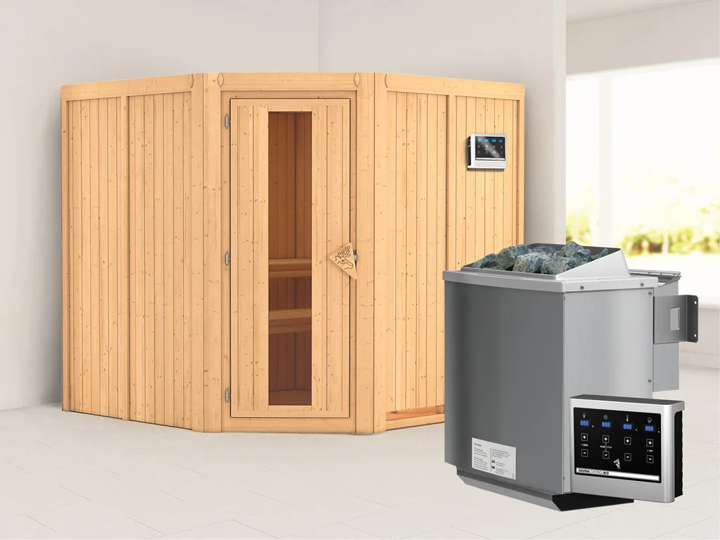 Diese Innensauna wird mit Saunaofen und einer externen Steuerung geliefert. Die Anbringung des Steuergerätes erfolgt an der Außenseite der Sauna. Ganz komfortabel kann somit die Saunasteuerung von außen erledigt und die Temperatur exakt bestimmt werden. Zusätzlich verfügt das Steuergerät über eine Anschlussstelle, über die ein weiteres elektrisches Gerät bedient werden kann.