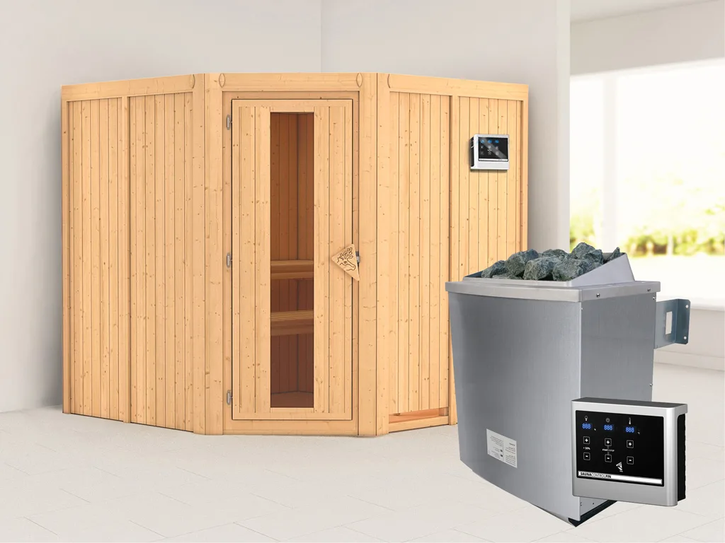 Diese Innensauna wird mit Saunaofen und einer externen Steuerung geliefert. Die Anbringung des Steuergerätes erfolgt an der Außenseite der Sauna. Ganz komfortabel kann somit die Saunasteuerung von außen erledigt und die Temperatur exakt bestimmt werden. Zusätzlich verfügt das Steuergerät über eine Anschlussstelle, über die ein weiteres elektrisches Gerät bedient werden kann.