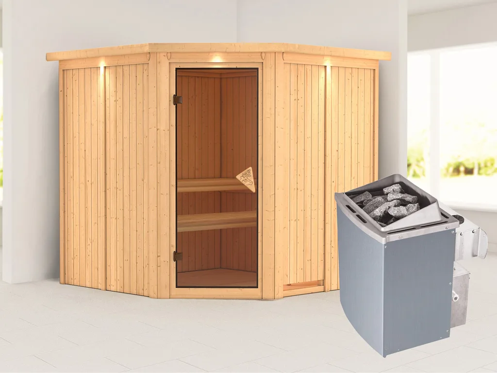 Die Sauna wird inklusive Saunaofen mit integrierter Steuerung geliefert. Durch die direkte Verbauung am Ofen ist die Bedienung mithilfe praktischer Drehschalter besonders einfach gestaltet – kompakt und preiswert.