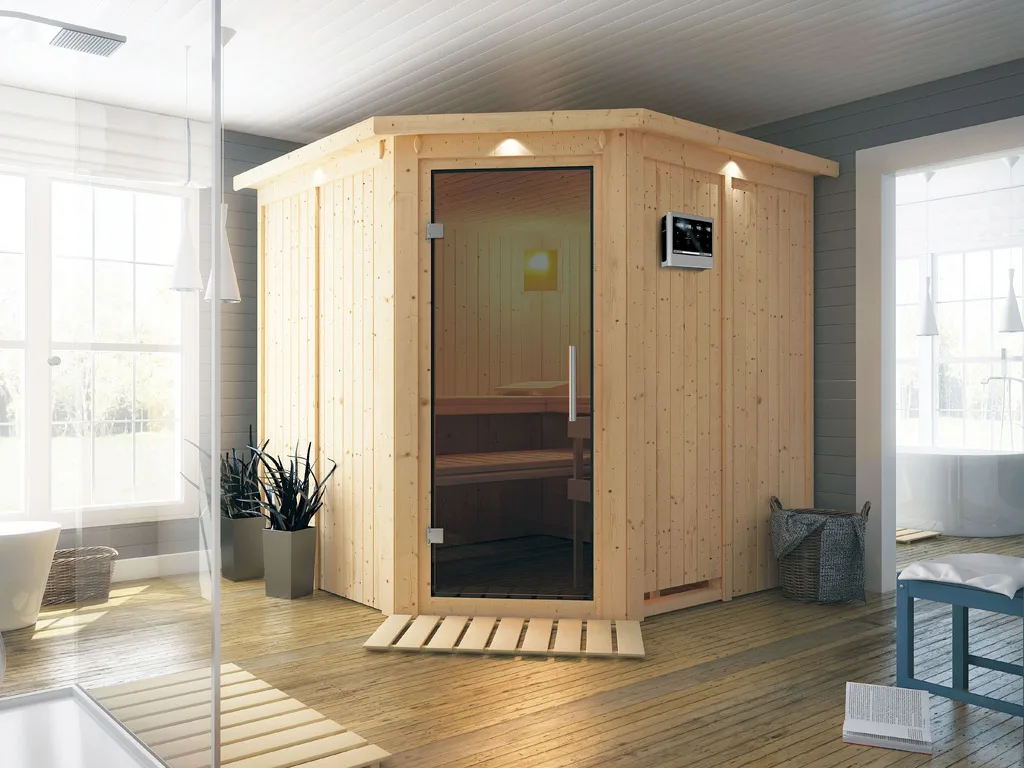 Diese Innensauna wird mit Saunaofen und einer externen Steuerung geliefert. Die Anbringung des Steuergerätes erfolgt an der Außenseite der Sauna. Ganz komfortabel kann somit die Saunasteuerung von außen erledigt und die Temperatur exakt bestimmt werden. Zusätzlich verfügt das Steuergerät über eine Anschlussstelle, über die ein weiteres elektrisches Gerät bedient werden kann.