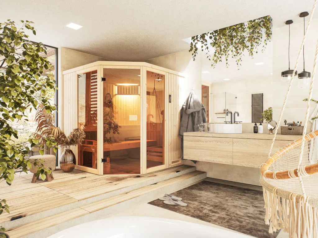 Bei der Montage einer Sauna muss ein Mindestabstand von 10 cm zu Wänden und Decke unbedingt eingehalten werden, um gute Luftzirkulation zu gewährleisten. So kann feucht-warme Luft besser abziehen. In diesem Zusammenhang müssen die Mindestraumhöhe und -breite beachtet werden.