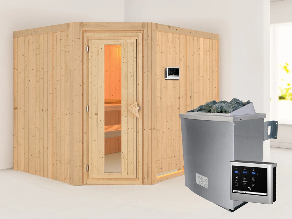 Bei dieser Innensauna ist ein Saunaofen mit einer externen Steuerung inklusive. Das Steuergerät wird außerhalb der Sauna angebracht. Auf diese Weise fängt schon vor dem Saunieren der Komfort an – mit einer bequemen Bedienung von außen und einer noch exakteren Temperatureinstellung. Weitere elektrische Geräte, wie die Kabinenbeleuchtung, können ebenso an die externe Steuerung angeschlossen und bedient werden.