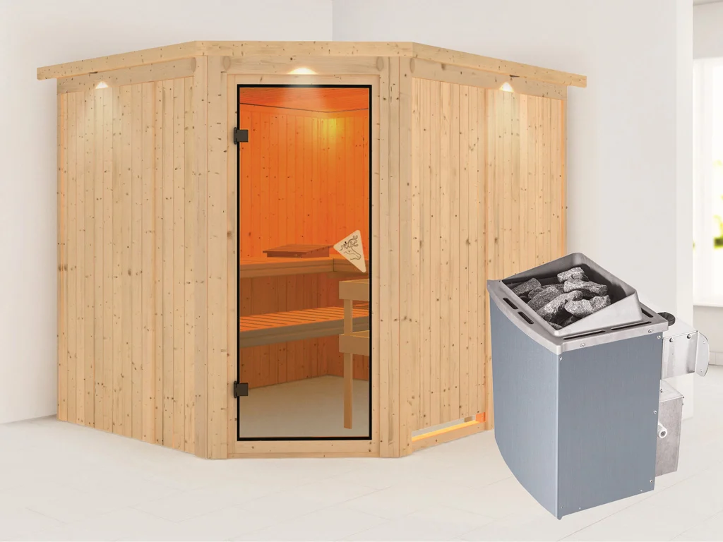 Die Sauna wird inklusive Saunaofen mit integrierter Steuerung geliefert. Durch die direkte Verbauung am Ofen ist die Bedienung mithilfe praktischer Drehschalter besonders einfach gestaltet – kompakt und preiswert.