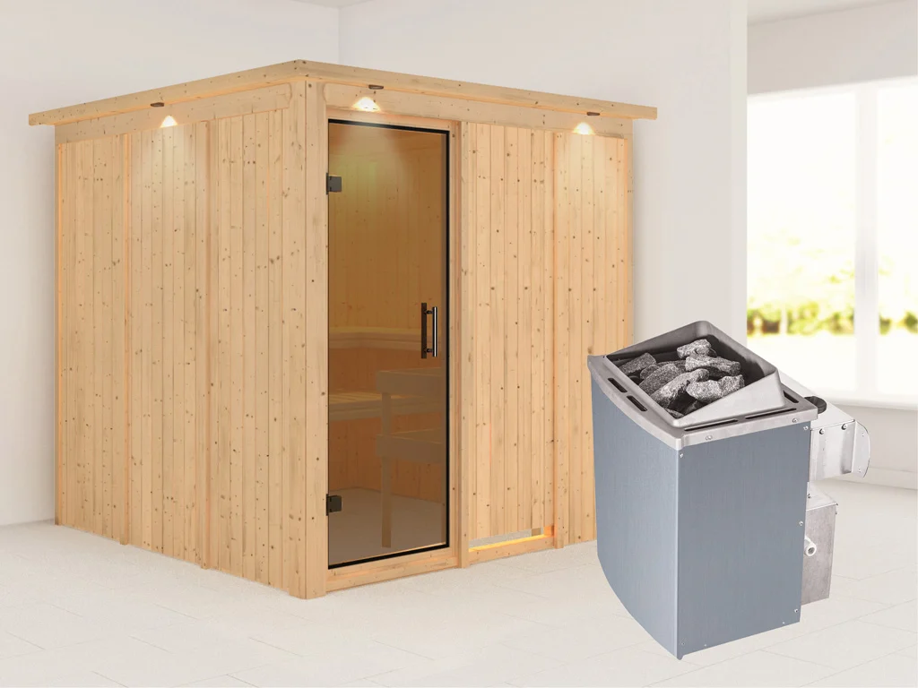 Diese Sauna wird einschließlich eines Bio-Kombiofens mit integrierter Steuerung geliefert. Am Ofen verbaut, ist die integrierte Steuerung durch Drehschalter sehr leicht zu bedienen.