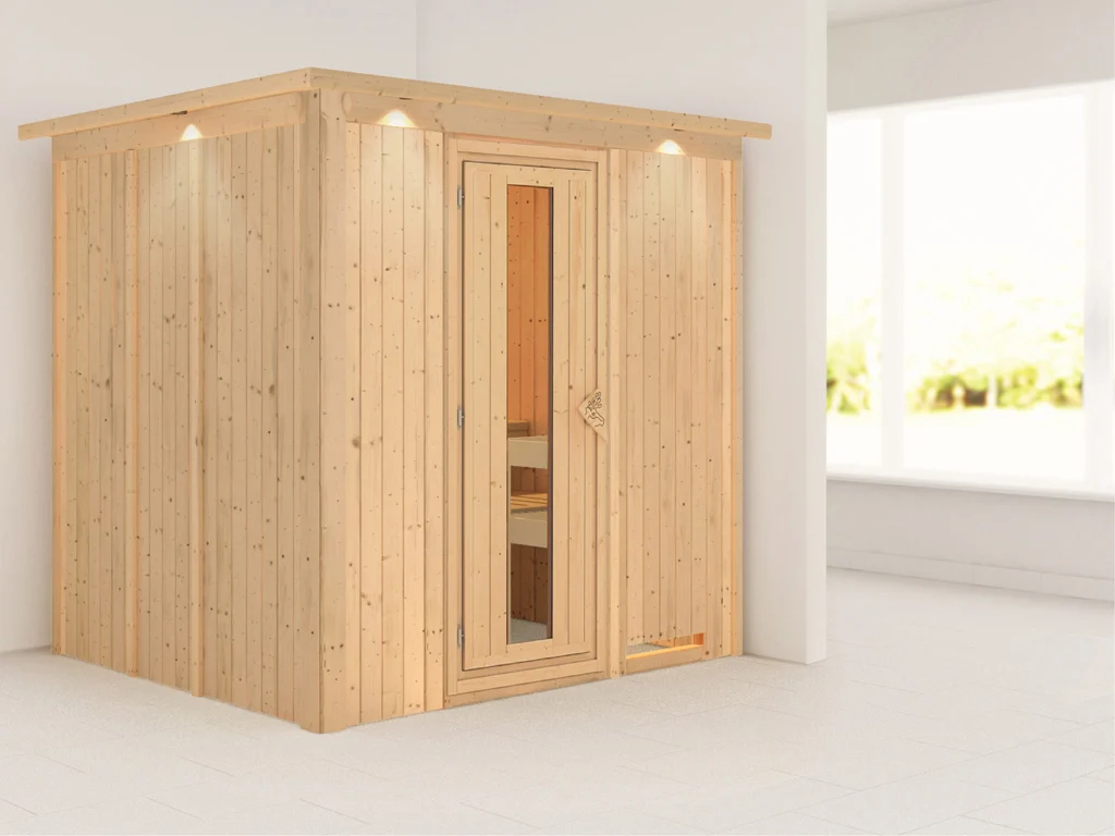 1 Kopfstütze aus Espenholz, 2 Liegen, Ofenschutzgitter aus stabilem Fichtenholz, Dachkranz inkl. 3 LED-Strahlern á 7, 5 Watt, Montageanleitung.