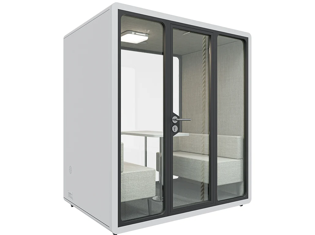 Die Telefon- und Meetingbox Quarto bietet eine effektive Rückzugsmöglichkeit für ungestörte Gespräche oder fokussiertes Arbeiten in offenen Büroumgebungen. Mit ihren kompakten Außenmaßen von 208,8 x 148,8 x 230 cm (L x T x H) ist sie für vier Personen ausgelegt und lässt sich flexibel im Raum positionieren. Die Kombination aus schallgedämmter Konstruktion (Reduktion um 35 Dezibel) und doppelverglaster Tür sorgt für eine ruhige Atmosphäre im Inneren – ideal für Telefonate oder virtuelle Meetings.