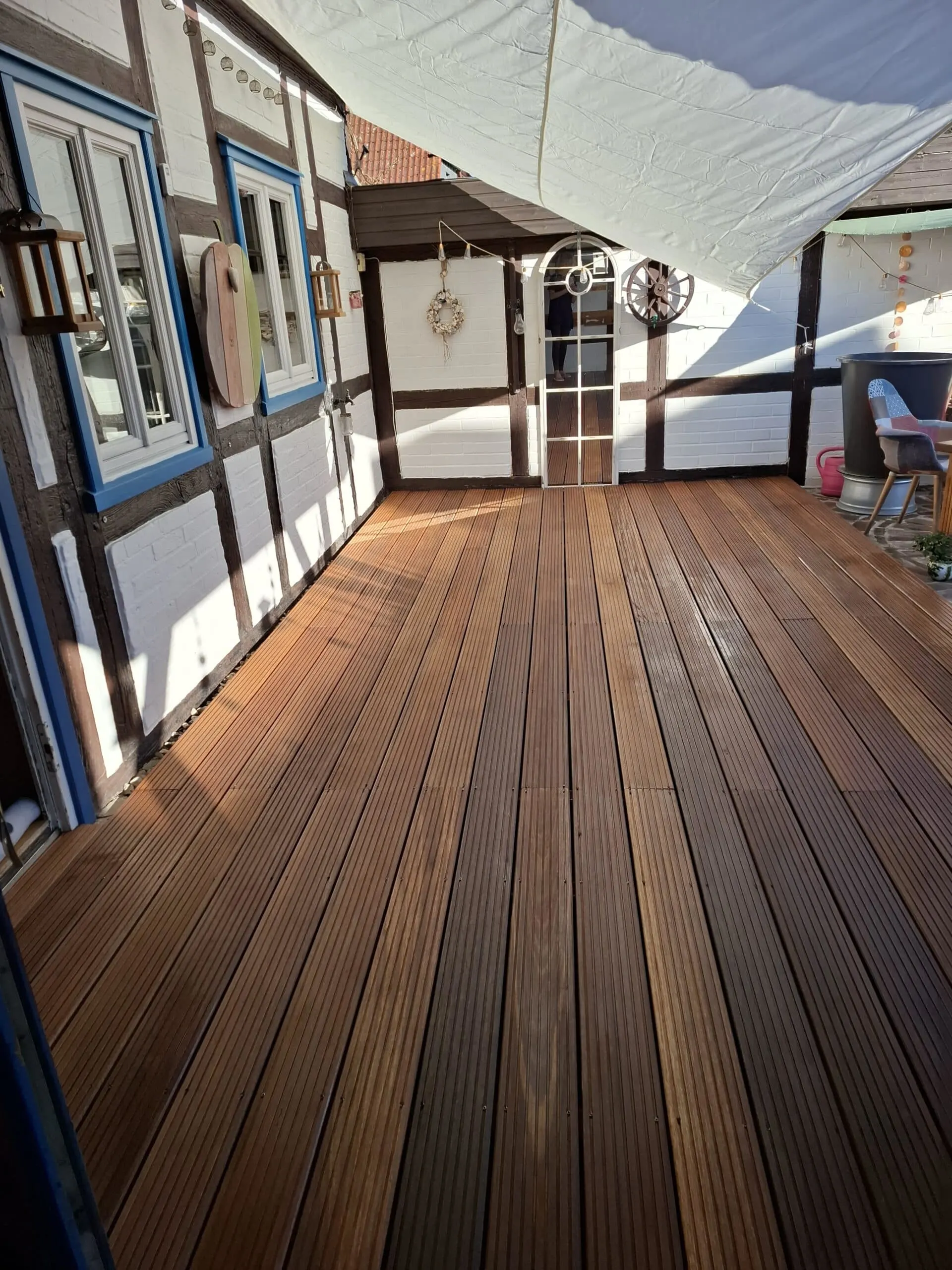 Bitte beachte, dass Farben und Maße unserer Holzterrassendielen produktionsbedingt sowie durch natürliche Materialeigenschaften leicht variieren können. Geringfügige Abweichungen stellen keinen Qualitätsmangel dar.
