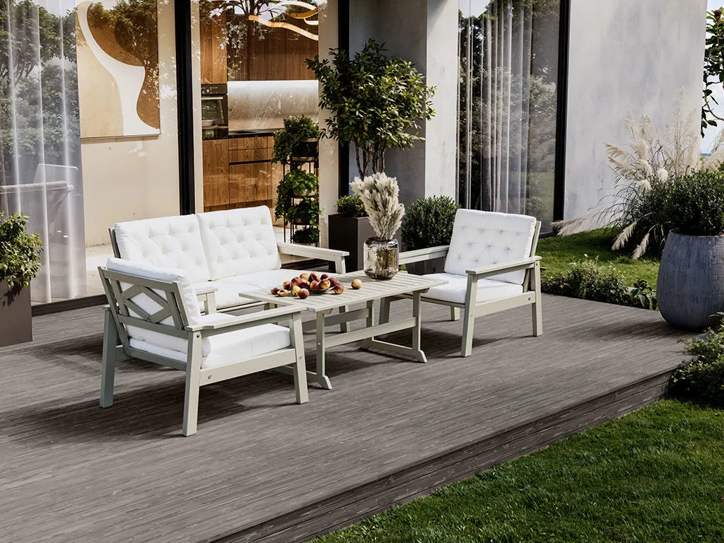 Durch eine regelmäßige Behandlung mit UV-undurchlässigen Anstrichen, wie pigmentierten Ölen, kann man einem einsetzenden witterungsbedingten Vergrauen des Holzes vorbeugen und so die Schönheit der Dielen und ihren natürlichen Farbton lange erhalten.