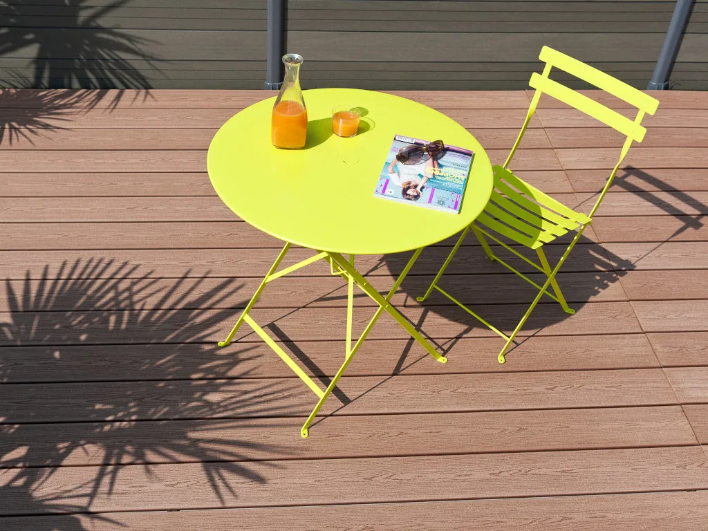 Diese 23 mm starken Terrassendielen werden aus WPC hergestellt. WPC (Wood Plastic Composite) ist eine Verbindung aus ca. 70 % Holz und 30 % Kunststoff mit vielen Vorteilen. Dieser Verbundwerkstoff ist nicht nur leicht zu pflegen und reinigen, sondern auch witterungsbeständig, form- und farbstabil, splitterfrei sowie rutschfest – der ideale Terrassenbelag. Außerdem zeichnet er sich durch die hohe Dichte aus, die ihn gut vor Insektenbefall schützt.