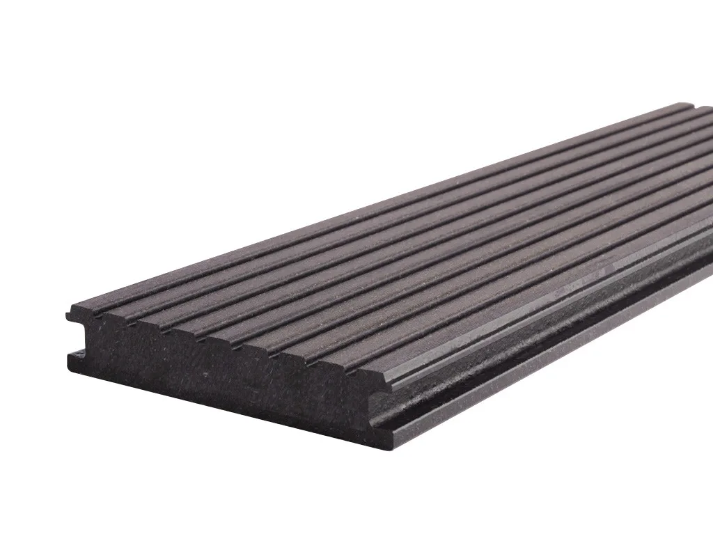 Diese 26 mm starke Terrassendielen werden aus WPC hergestellt.