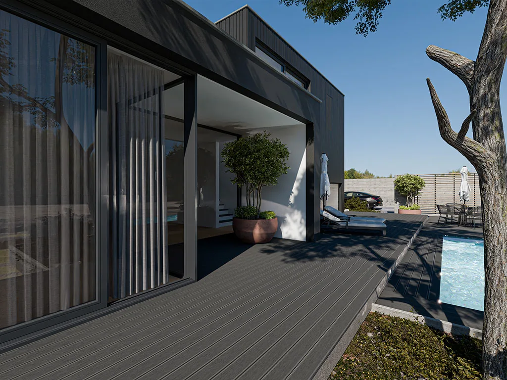 Das Massivprofil der Terrassendielen macht sie zu sehr tragfähigen, robusten und formstabilen Begleitern, die auch mit einer leichten Unterkonstruktion auskommen. Sie erlauben kein Eindringen von Wasser und sind sehr witterungsfest. Beim Verlegen von massiven Terrassendielen kann auf die Abschlussleisten verzichtet werden. WPC-Terrassendielen mit Massivprofil sind äußerst splitter- und reißfest, weshalb sie sich ideal als Poolumrandung eignen.