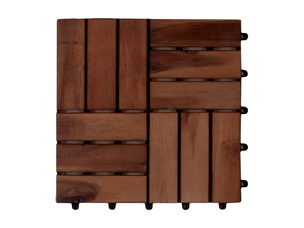 Diese 24 mm starken Terrassenfliesen werden aus Akazie hergestellt. Das gold- bis olivbraune Holz der Akazie besticht mit seiner glatten Oberfläche und der lebhaften Maserung. Als Hartholz ist die Akazie besonders unempfindlich und widerstandsfähig, sodass Witterungseinflüsse dem Holz nichts anhaben können. Mit der Dauerhaftigkeitsklasse 1–2 findet Akazienholz oft seinen Einsatz im Außenbereich. Das aus Australien stammende Holz weist aufgrund seiner hohen Elastizität zudem kaum Rissbildungen auf und verfügt über ein geringes Quell- und Schwindverhalten. Eine natürliche Resistenz gegenüber Feuchtigkeit macht das Akazienholz zu einem guten Werkstoff für den Außenbereich.