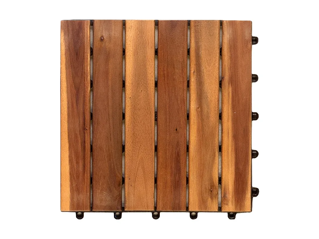 Diese 24 mm starken Terrassenfliesen werden aus Akazie hergestellt. Das gold- bis olivbraune Hartholz der Akazie besticht mit seiner glatten Oberfläche und der lebhaften Maserung durch ausgeprägte Jahresringe und Streifenzeichnung sowie mit robusten und wetterfesten Eigenschaften. Es ist sehr biegsam und verfügt nur über geringeres Quell- und Schwindverhalten, sodass es kaum zu Rissbildungen kommt und das Holz leicht zu verarbeiten ist. Eine Behandlung mit Holzschutzmitteln schützt vor Sonneneinstrahlung.
