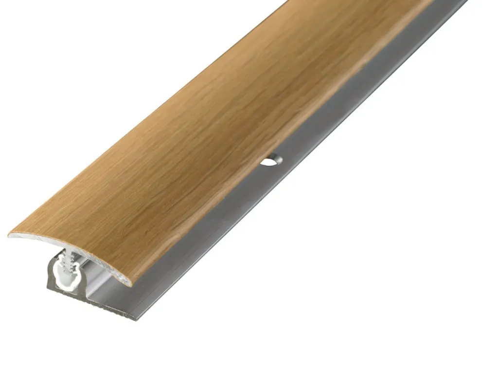Die Aluminiumoberfläche ist mit einer Dekorfolie in Eiche-Natur-Optik versehen, die dem Profil eine warme, natürliche Ausstrahlung verleiht und gleichzeitig vor Abnutzung schützt. Das Profil gleicht Unebenheiten zuverlässig aus, sorgt für einen sicheren Übergang zwischen Bodenbelägen und rundet das Gesamtbild elegant ab. Dank des durchdachten Designs ist die Montage einfach und sicher – für einen präzisen, langlebigen Abschluss ohne großen Aufwand.